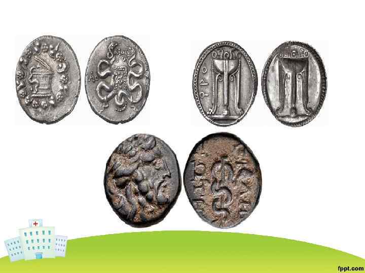 • Первые надписи и изображения, которые олицетворяли медицину, появились на монетах в Древней Греции. Наряду с богами и правителями чеканилась ЗМЕЯ. В некоторых случаях она была одна, в некоторых- с треножником Аполлона, в других- с посохом Асклепия.