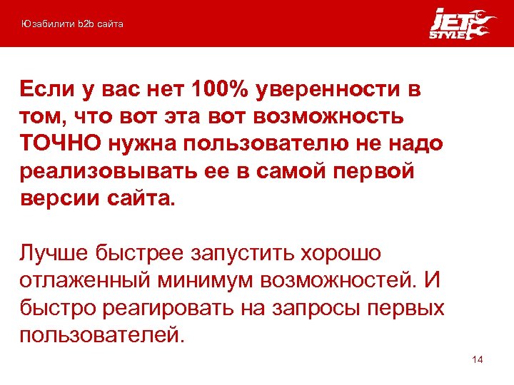 Юзабилити b 2 b сайта Если у вас нет 100% уверенности в том, что вот эта вот возможность ТОЧНО нужна пользователю не надо реализовывать ее в самой первой версии сайта. Лучше быстрее запустить хорошо отлаженный минимум возможностей. И быстро реагировать на запросы первых пользователей. 14