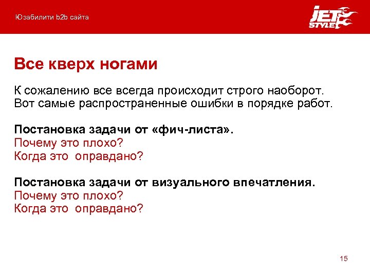Юзабилити b 2 b сайта Все кверх ногами К сожалению всегда происходит строго наоборот. Вот самые распространенные ошибки в порядке работ. Постановка задачи от «фич-листа» . Почему это плохо? Когда это оправдано? Постановка задачи от визуального впечатления. Почему это плохо? Когда это оправдано? 15