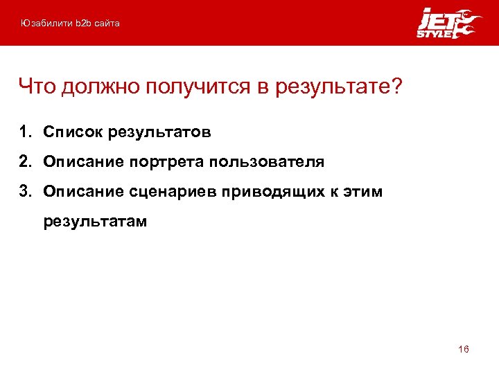 Юзабилити b 2 b сайта Что должно получится в результате? 1. Список результатов 2. Описание портрета пользователя 3. Описание сценариев приводящих к этим результатам 16