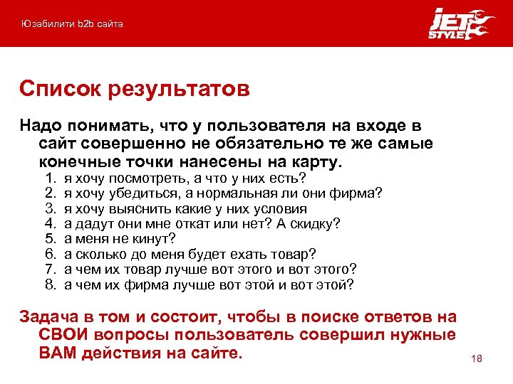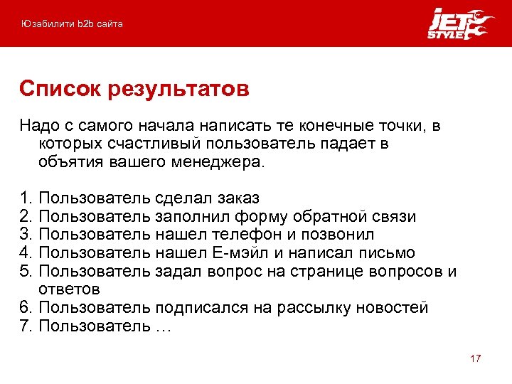 Юзабилити b 2 b сайта Список результатов Надо с самого начала написать те конечные точки, в которых счастливый пользователь падает в объятия вашего менеджера. 1. Пользователь сделал заказ 2. Пользователь заполнил форму обратной связи 3. Пользователь нашел телефон и позвонил 4. Пользователь нашел Е-мэйл и написал письмо 5. Пользователь задал вопрос на странице вопросов и ответов 6. Пользователь подписался на рассылку новостей 7. Пользователь … 17