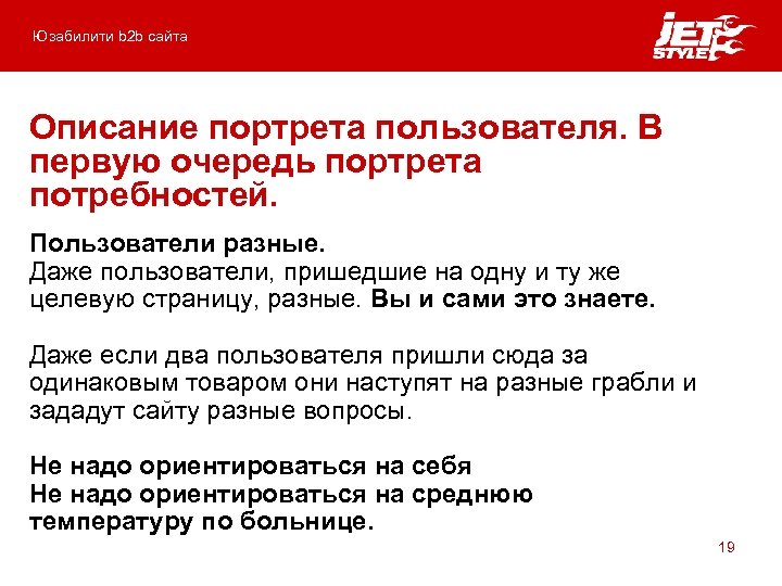 Юзабилити b 2 b сайта Описание портрета пользователя. В первую очередь портрета потребностей. Пользователи разные. Даже пользователи, пришедшие на одну и ту же целевую страницу, разные. Вы и сами это знаете. Даже если два пользователя пришли сюда за одинаковым товаром они наступят на разные грабли и зададут сайту разные вопросы. Не надо ориентироваться на себя Не надо ориентироваться на среднюю температуру по больнице. 19