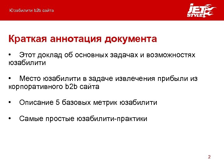 Юзабилити b 2 b сайта Краткая аннотация документа • Этот доклад об основных задачах и возможностях юзабилити • Место юзабилити в задаче извлечения прибыли из корпоративного b 2 b сайта • Описание 5 базовых метрик юзабилити • Самые простые юзабилити-практики 2