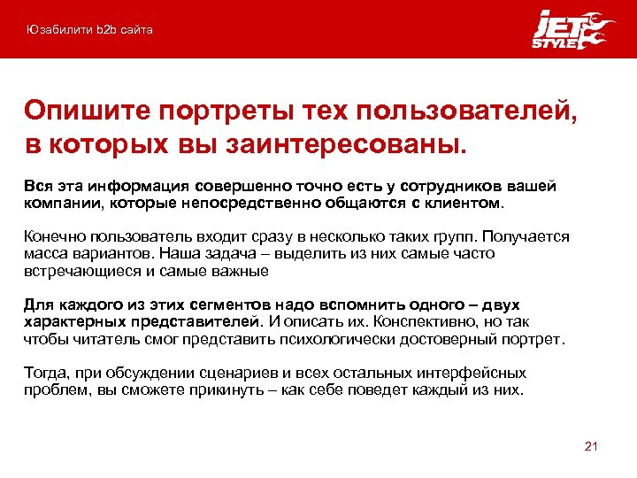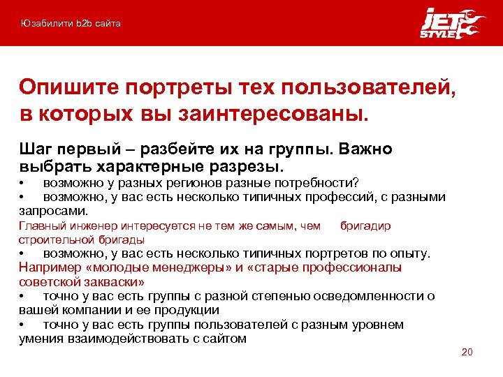 Юзабилити b 2 b сайта Опишите портреты тех пользователей, в которых вы заинтересованы. Шаг первый – разбейте их на группы. Важно выбрать характерные разрезы. • возможно у разных регионов разные потребности? • возможно, у вас есть несколько типичных профессий, с разными запросами. Главный инженер интересуется не тем же самым, чем строительной бригады бригадир • возможно, у вас есть несколько типичных портретов по опыту. Например «молодые менеджеры» и «старые профессионалы советской закваски» • точно у вас есть группы с разной степенью осведомленности о вашей компании и ее продукции • точно у вас есть группы пользователей с разным уровнем умения взаимодействовать с сайтом 20