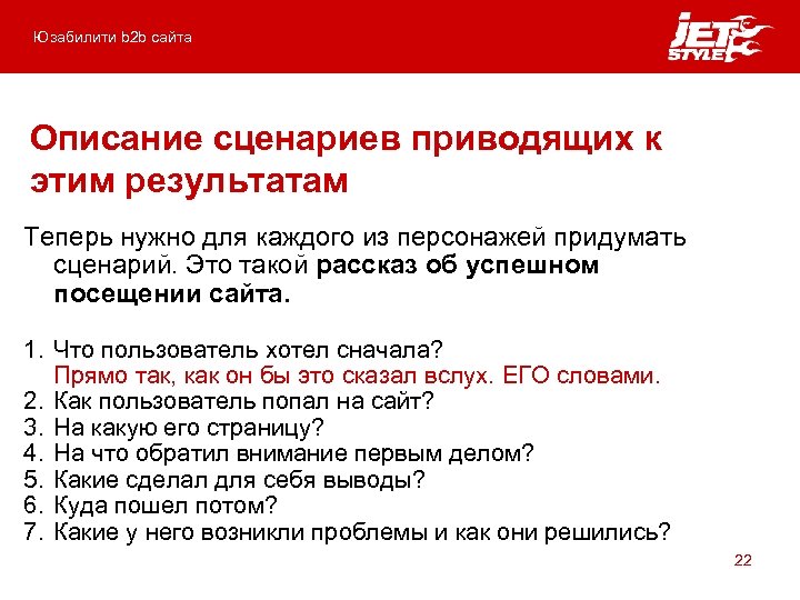 Юзабилити b 2 b сайта Описание сценариев приводящих к этим результатам Теперь нужно для каждого из персонажей придумать сценарий. Это такой рассказ об успешном посещении сайта. 1. Что пользователь хотел сначала? Прямо так, как он бы это сказал вслух. ЕГО словами. 2. Как пользователь попал на сайт? 3. На какую его страницу? 4. На что обратил внимание первым делом? 5. Какие сделал для себя выводы? 6. Куда пошел потом? 7. Какие у него возникли проблемы и как они решились? 22