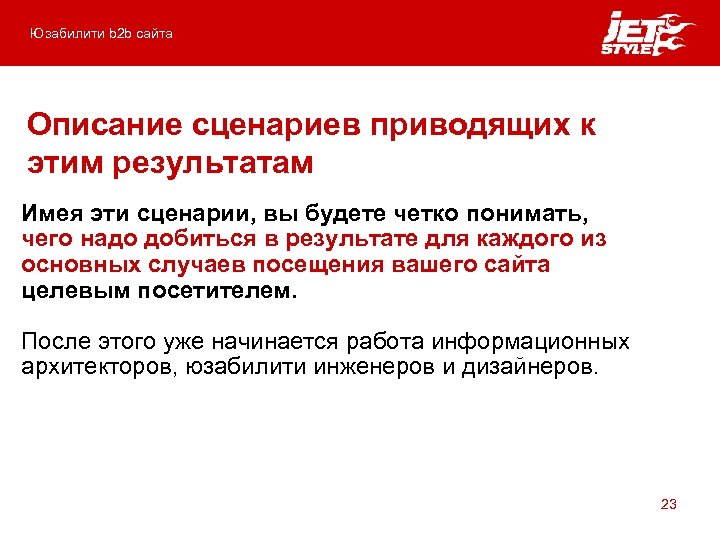 Юзабилити b 2 b сайта Описание сценариев приводящих к этим результатам Имея эти сценарии, вы будете четко понимать, чего надо добиться в результате для каждого из основных случаев посещения вашего сайта целевым посетителем. После этого уже начинается работа информационных архитекторов, юзабилити инженеров и дизайнеров. 23