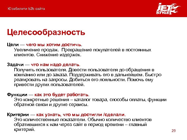 Юзабилити b 2 b сайта Целесообразность Цели — чего мы хотим достичь. Увеличение продаж. Превращение покупателей в постоянных клиентов. Снижение издержек. Задачи — что нам надо делать. Получить пользователя. Довести пользователя до обращения в компанию или до заказа. Поддерживать его в дальнейшем. Быстро реагировать на запросы. Добиться его лояльности. Помочь ему привести других пользователей. Функции — как это будет работать. Это конкретные решения – каталог товара, способы оплаты, функции обратной связи и другие сервисы. Критерии — как узнать, что мы достигли /сделали. Это количественные показатели. Обычно количество клиентов обратившихся к нам через сайт в период времени – главный критерий. 25