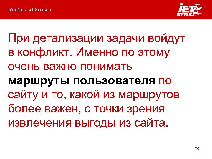 Юзабилити b 2 b сайта При детализации задачи войдут в конфликт. Именно по этому очень важно понимать маршруты пользователя по сайту и то, какой из маршрутов более важен, с точки зрения извлечения выгоды из сайта. 26