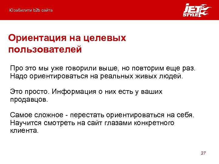 Юзабилити b 2 b сайта Ориентация на целевых пользователей Про это мы уже говорили выше, но повторим еще раз. Надо ориентироваться на реальных живых людей. Это просто. Информация о них есть у ваших продавцов. Самое сложное - перестать ориентироваться на себя. Научится смотреть на сайт глазами конкретного клиента. 27