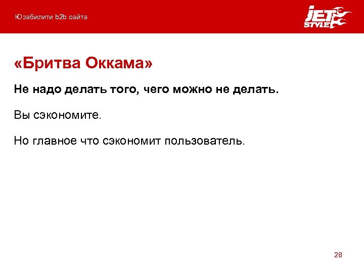Юзабилити b 2 b сайта «Бритва Оккама» Не надо делать того, чего можно не делать. Вы сэкономите. Но главное что сэкономит пользователь. 28
