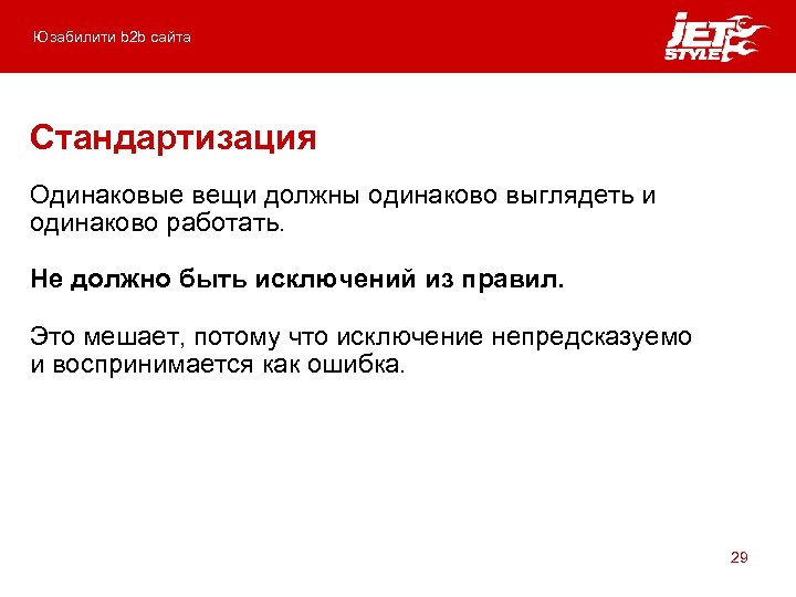 Юзабилити b 2 b сайта Стандартизация Одинаковые вещи должны одинаково выглядеть и одинаково работать. Не должно быть исключений из правил. Это мешает, потому что исключение непредсказуемо и воспринимается как ошибка. 29