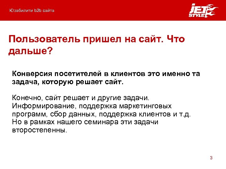Юзабилити b 2 b сайта Пользователь пришел на сайт. Что дальше? Конверсия посетителей в клиентов это именно та задача, которую решает сайт. Конечно, сайт решает и другие задачи. Информирование, поддержка маркетинговых программ, сбор данных, поддержка клиентов и т. д. Но в рамках нашего семинара эти задачи второстепенны. 3