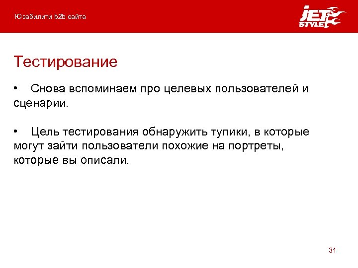 Юзабилити b 2 b сайта Тестирование • Снова вспоминаем про целевых пользователей и сценарии. • Цель тестирования обнаружить тупики, в которые могут зайти пользователи похожие на портреты, которые вы описали. 31