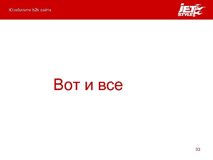 Юзабилити b 2 b сайта Пять компонент юзабилити Обучаемость — необходимость долгого обучения отвращает Эффективность — если на задачу тратится много времени, то будут искаться более простые пути Запоминаемость — учиться каждый раз надоедает Ошибки — каждая ошибка — это «пощёчина» по уверенности пользователя + потерянное время Удовлетворённость — складывается несознательно 32