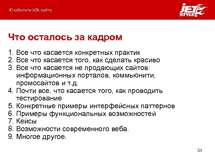 Юзабилити b 2 b сайта Что осталось за кадром 1. Все что касается конкретных практик 2. Все что касается того, как сделать красиво 3. Все что касается не продающих сайтов: информационных порталов, коммьюнити, промосайтов и т. д. 4. Почти все, что касается того, как проводить тестирование 5. Конкретные примеры интерфейсных паттернов 6. Примеры функциональных возможностей 7. Кейсы 8. Возможности современного веба. 9. Многое другое. 34