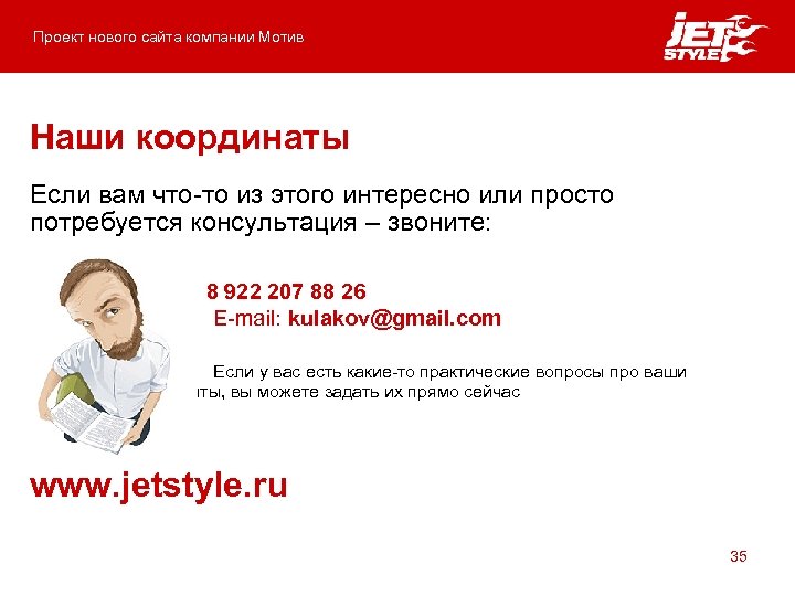 Проект нового сайта компании Мотив Наши координаты Если вам что-то из этого интересно или просто потребуется консультация – звоните: 8 922 207 88 26 E-mail: kulakov@gmail. com Если у вас есть какие-то практические вопросы про ваши сайты, вы можете задать их прямо сейчас www. jetstyle. ru 35
