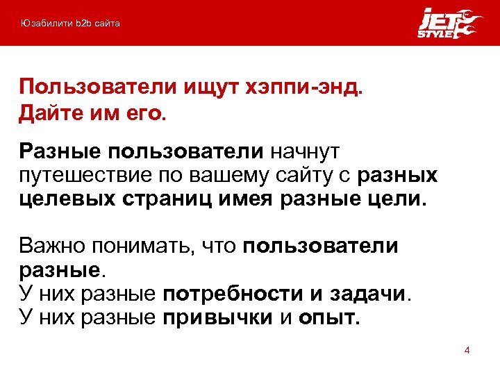 Юзабилити b 2 b сайта Пользователи ищут хэппи-энд. Дайте им его. Разные пользователи начнут путешествие по вашему сайту с разных целевых страниц имея разные цели. Важно понимать, что пользователи разные. У них разные потребности и задачи. У них разные привычки и опыт. 4