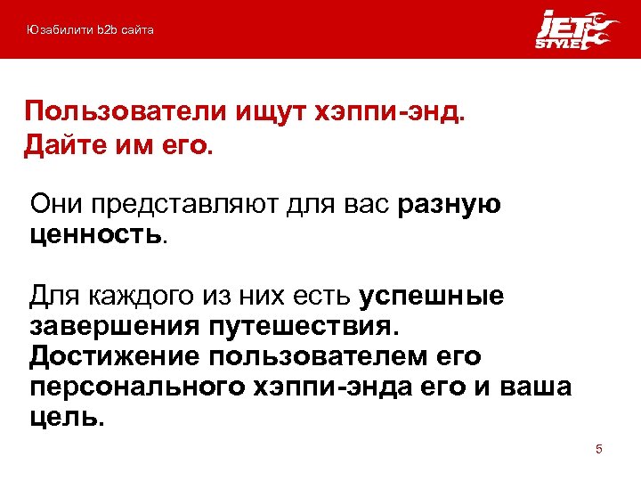 Юзабилити b 2 b сайта Пользователи ищут хэппи-энд. Дайте им его. Они представляют для вас разную ценность. Для каждого из них есть успешные завершения путешествия. Достижение пользователем его персонального хэппи-энда его и ваша цель. 5