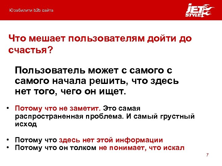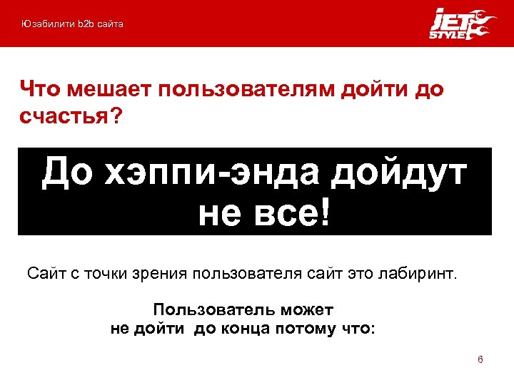Юзабилити b 2 b сайта Что мешает пользователям дойти до счастья? До хэппи-энда дойдут не все! Сайт с точки зрения пользователя сайт это лабиринт. Пользователь может не дойти до конца потому что: 6