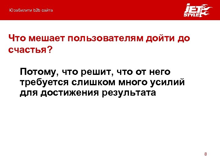Юзабилити b 2 b сайта Что мешает пользователям дойти до счастья? Потому, что решит, что от него требуется слишком много усилий для достижения результата 8