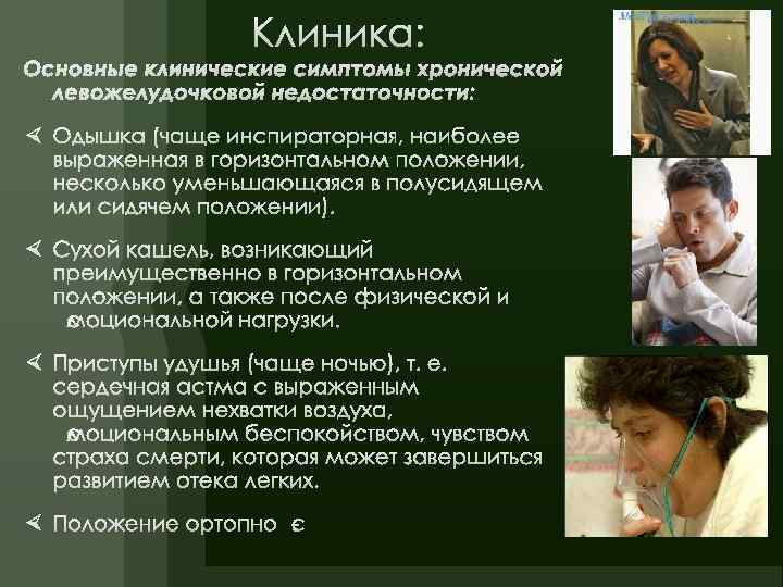 p Крепитация и мелкопузырчатые хрипы в нижних отделах обоих легких, не исчезающие после энергичного откашливания и не обусловленные воспалительной инфильтрацией в легких. p Дилатация левого желудочка. p Акцент II тона на легочной артерии. p Появление патологического III тона и протодиастолический ритм галопа (левожелудочковый, лучше прослушивающийся в области верхушки сердца). p Альтернирующий пульс. p Отсутствие периферических отеков, застойной гепатомегалии, асцита.