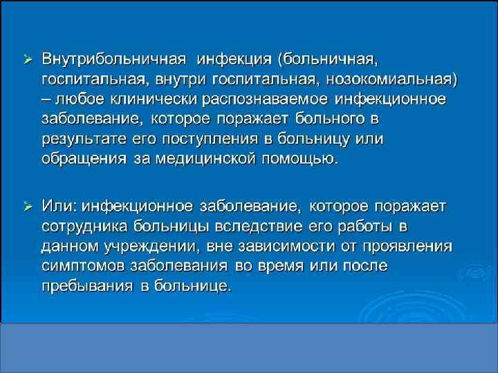 ГОСПИТАЛЬНАЯ (ВНУТРИБОЛЬНИЧНАЯ) ИНФЕКЦИЯ • Госпитальная (внутрибольничная) инфекция – это инфекционные заболевание, обусловленное инфицированием больного, произошедшим во время его нахождения в лечебном учреждении. • В настоящее время развитие гнойно-септического заболевания, обусловленного внутригоспитальным инфицированием, расценивается как ятрогенное осложнение, так как связано с недостатками и ошибками в деятельности медицинских работников.