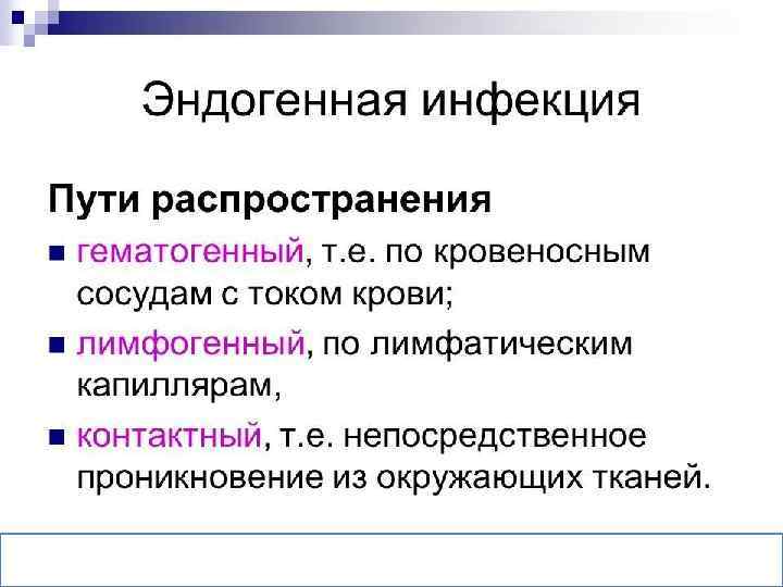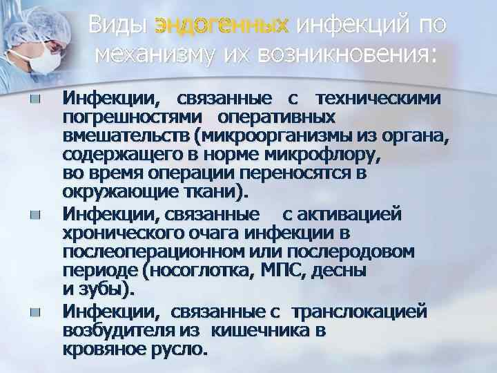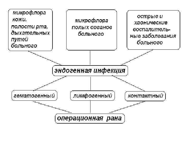 Профилактика эндогенной инфекции • Профилактика эндогенного инфицирования микробами обязательна перед плановой и экстренной операциями, но проводится по-разному. Перед плановой операцией больной обследуется, и в случае выявления очагов инфекции проводится их санация. Для уменьшения риска эндогенного инфицирования плановая операция откладывается минимум на две недели, если пациент перенес острое инфекционное заболевание. При выполнении экстренных операций, чтобы уменьшить возможность переноса микробов в зону оперативного доступа, больному назначают антибактериальные препараты (чаще антибиотики): перед операцией, во время ее проведения и в послеоперационный период. Если очаг инфекции находится в зоне операции, принимаются меры по предупреждению контактного инфицирования во время операции.