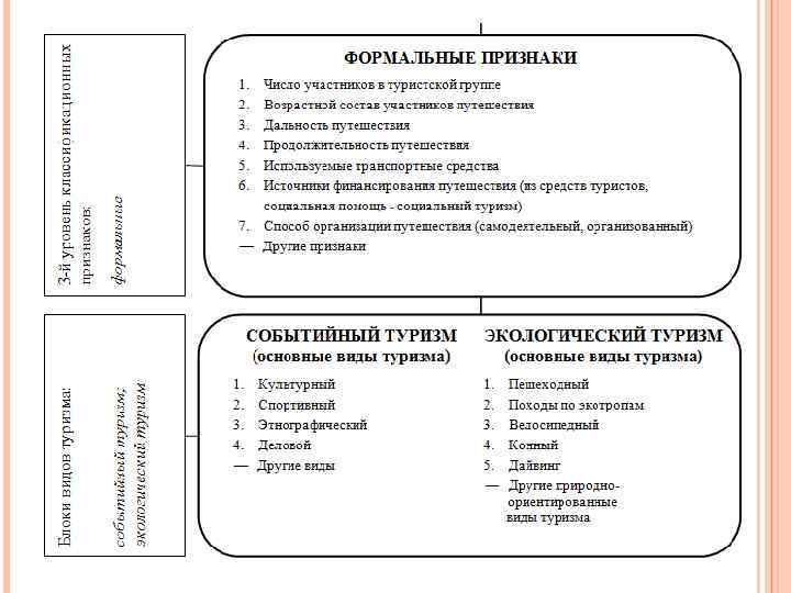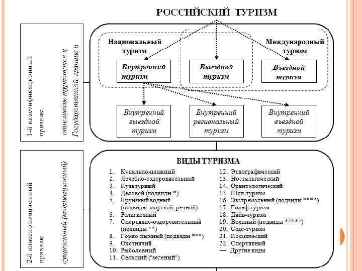 • • • * подвиды делового туризма: классические деловые поездки ** подвиды спортивно-оздоровительного туризма: пешеходный, горный, водный на гребных судах, водный парусный, лыжный, велосипедный, спелеотуризм, конный, авто-мототуризм *** подвиды горнолыжного туризма: горные лыжи, сноубординг **** подвиды экстремального туризма: каньонинг, горный велосипед, каякинг и др. ***** подвиды военного туризма: полеты на самолетах, боевые стрельбы, танковые туры и др.