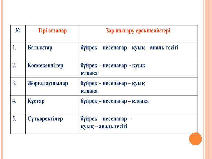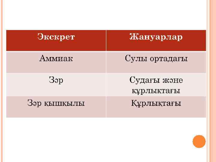 АДАМ ОРГАНИЗІМІНЕН БӨЛІНЕДІ Диссимиляция нәтижесіндегі заттар қанға түсіп, одан соң сыртқа шығады: Бүйрек арқылы (NH 3, H 2 O, мочевина, тұз); Өкпе арқылы: (СО 2, Н 2 О); Тері арқылы: көмірқышқыл газының қалдықтары; тері бездерінен суды, тұзды, 1% мочевина мен аммиакты шығарады; Ішектер арқылы: өт пигменттері және ауыр металдардың тұздары шығады