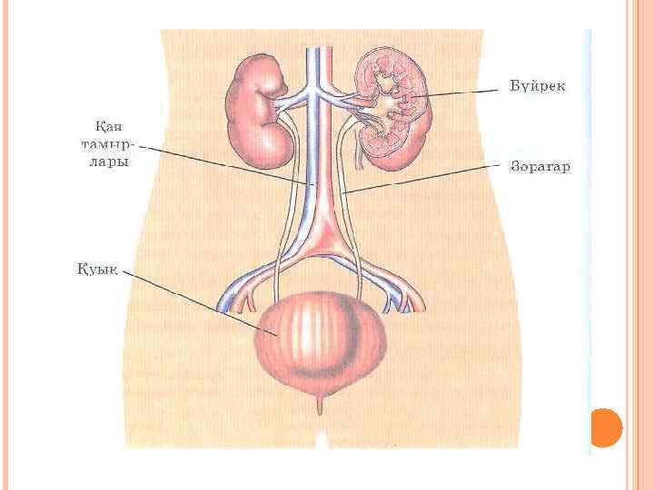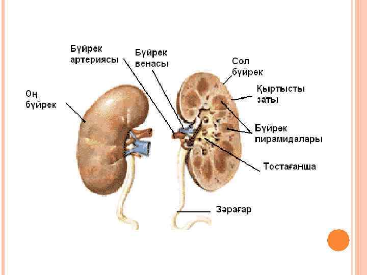БҮЙРЕКТІҢ ҚҰРЫЛЫСЫ МЕН ҚЫЗМЕТІ Зәр түзуші мүше – бүйрек Үрме бұршақ пішінді жұп мүше Бүйректің жоғарысында эндокрин безедері – қыртыс және ми қабатынан тұратын бүйрік үсті бездері орналасқан Бүйректің салмағы 150 г, сырты қоңырқай түсті қабаттан ішкі бозғұлт түсті ми затынан түрады. Бүйректің қызметі. Бүйрек зат алмасуға қатысады. Бүйрек шумақтарында нәруыздар түзеледі. Ағзаларда амин қышқылдарының қорын калпына келтіруге мүмкіндік жасайды. Қорғанышты қызметі (зат алмасу процесінде бөлінетін улы заттарды шығарады); Ағзаның ішкі ортасының қалыптасуына қатысады.