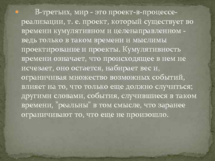 В-третьих, мир - это проект-в-процессе- реализации, т. е. проект, который существует во времени кумулятивном и целенаправленном - ведь только в таком времени и мыслимы проектирование и проекты. Кумулятивность времени означает, что происходящее в нем не исчезает, оно остается, набирает вес и, ограничивая множество возможных событий, влияет на то, что только еще должно случиться; другими словами, события, случившиеся в таком времени, "реальны" в том смысле, что заранее ограничивают то, что еще не произошло.