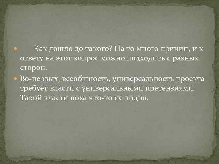 Как дошло до такого? На то много причин, и к ответу на этот вопрос можно подходить с разных сторон. Во-первых, всеобщность, универсальность проекта требует власти с универсальными претензиями. Такой власти пока что-то не видно.