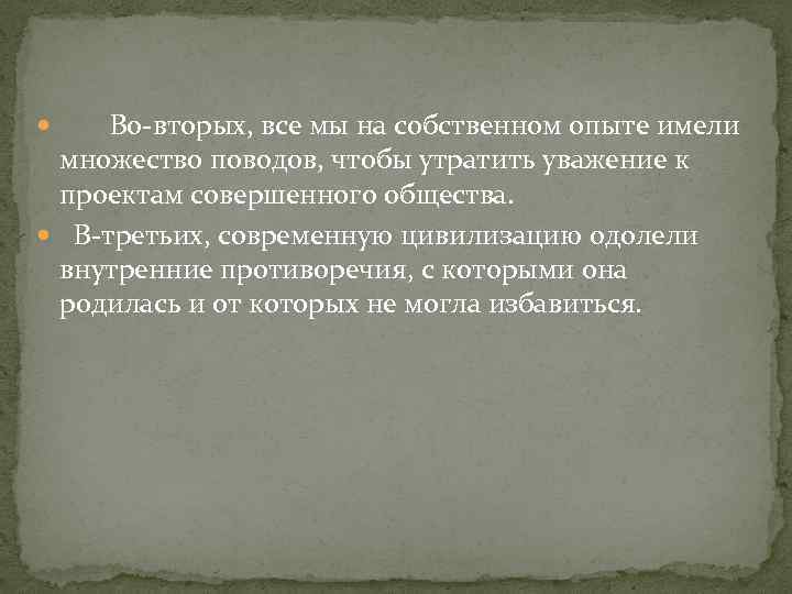 Во-вторых, все мы на собственном опыте имели множество поводов, чтобы утратить уважение к проектам совершенного общества. В-третьих, современную цивилизацию одолели внутренние противоречия, с которыми она родилась и от которых не могла избавиться.