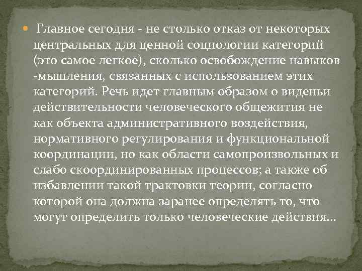 Главное сегодня - не столько отказ от некоторых центральных для ценной социологии категорий (это самое легкое), сколько освобождение навыков -мышления, связанных с использованием этих категорий. Речь идет главным образом о виденьи действительности человеческого общежития не как объекта административного воздействия, нормативного регулирования и функциональной координации, но как области самопроизвольных и слабо скоординированных процессов; а также об избавлении такой трактовки теории, согласно которой она должна заранее определять то, что могут определить только человеческие действия. . .