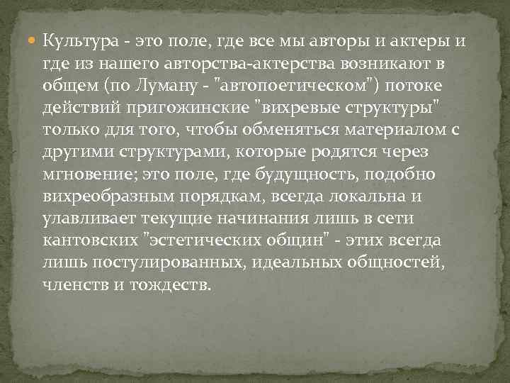 Культура - это поле, где все мы авторы и актеры и где из нашего авторства-актерства возникают в общем (по Луману - "автопоетическом") потоке действий пригожинские "вихревые структуры" только для того, чтобы обменяться материалом с другими структурами, которые родятся через мгновение; это поле, где будущность, подобно вихреобразным порядкам, всегда локальна и улавливает текущие начинания лишь в сети кантовских "эстетических общин" - этих всегда лишь постулированных, идеальных общностей, членств и тождеств.