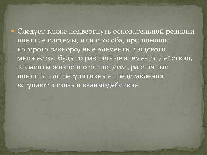 Следует также подвергнуть основательной ревизии понятие системы, или способа, при помощи которого разнородные элементы людского множества, будь то различные элементы действия, элементы жизненного процесса, различные понятия или регулятивные представления вступают в связь и взаимодействие.