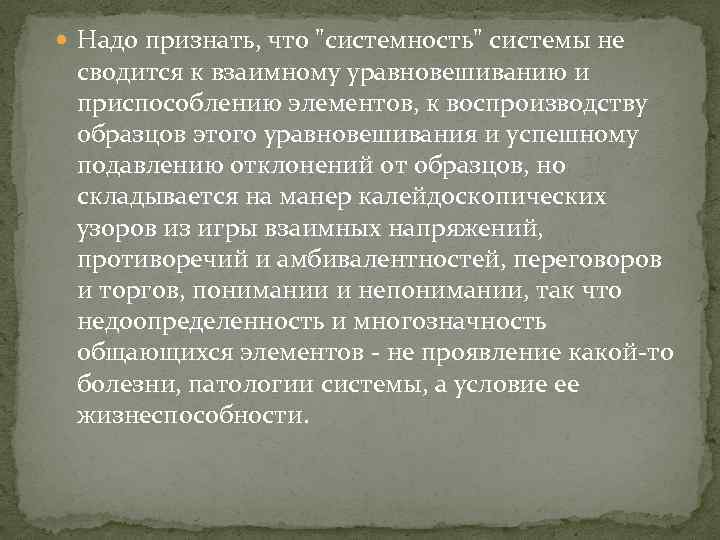 Надо признать, что "системность" системы не сводится к взаимному уравновешиванию и приспособлению элементов, к воспроизводству образцов этого уравновешивания и успешному подавлению отклонений от образцов, но складывается на манер калейдоскопических узоров из игры взаимных напряжений, противоречий и амбивалентностей, переговоров и торгов, понимании и непонимании, так что недоопределенность и многозначность общающихся элементов - не проявление какой-то болезни, патологии системы, а условие ее жизнеспособности.