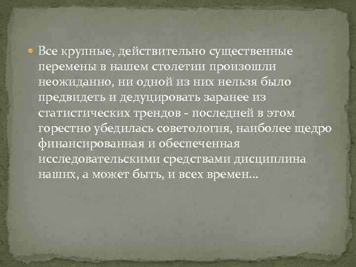 Все крупные, действительно существенные перемены в нашем столетии произошли неожиданно, ни одной из них нельзя было предвидеть и дедуцировать заранее из статистических трендов - последней в этом горестно убедилась советология, наиболее щедро финансированная и обеспеченная исследовательскими средствами дисциплина наших, а может быть, и всех времен. . .