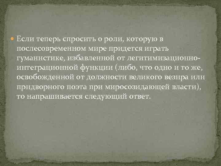 Если теперь спросить о роли, которую в послесовременном мире придется играть гуманистике, избавленной от легитимизационноинтеграционной функции (либо, что одно и то же, освобожденной от должности великого везира или придворного поэта при миросозидающей власти), то напрашивается следующий ответ.