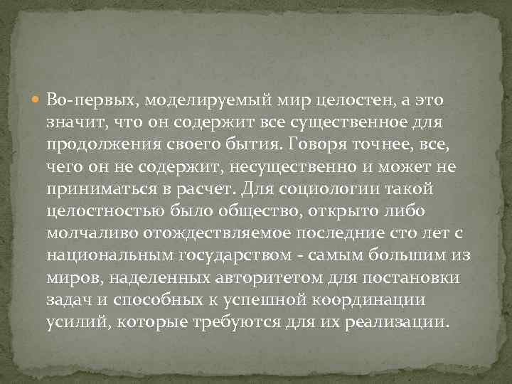 Во-первых, моделируемый мир целостен, а это значит, что он содержит все существенное для продолжения своего бытия. Говоря точнее, все, чего он не содержит, несущественно и может не приниматься в расчет. Для социологии такой целостностью было общество, открыто либо молчаливо отождествляемое последние сто лет с национальным государством - самым большим из миров, наделенных авторитетом для постановки задач и способных к успешной координации усилий, которые требуются для их реализации.