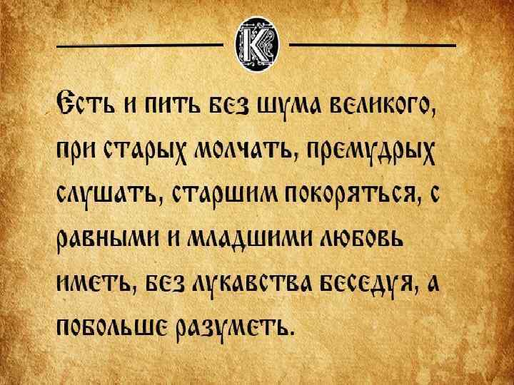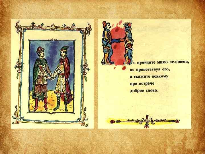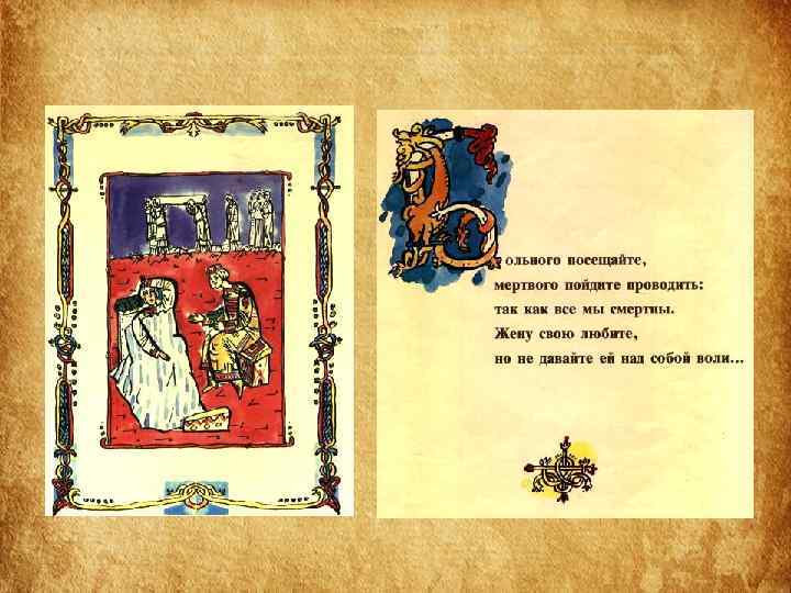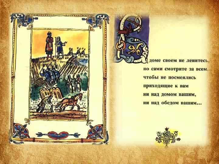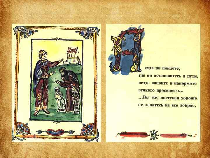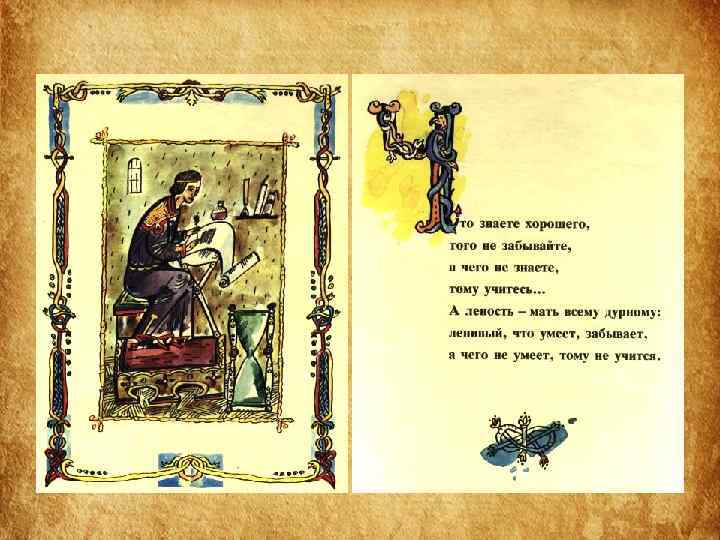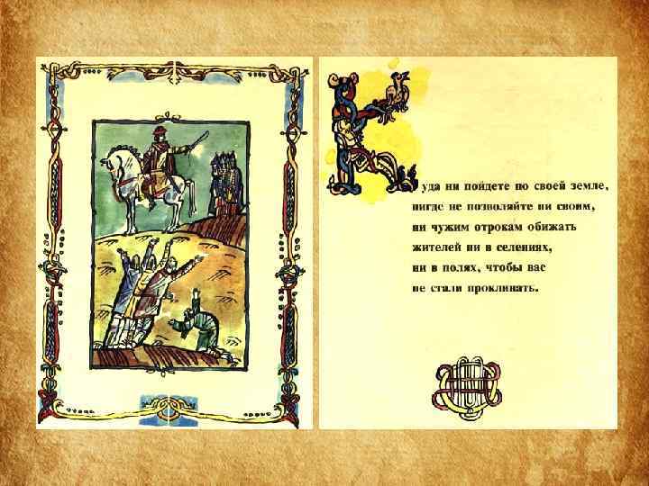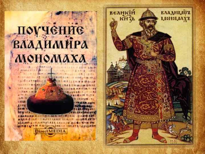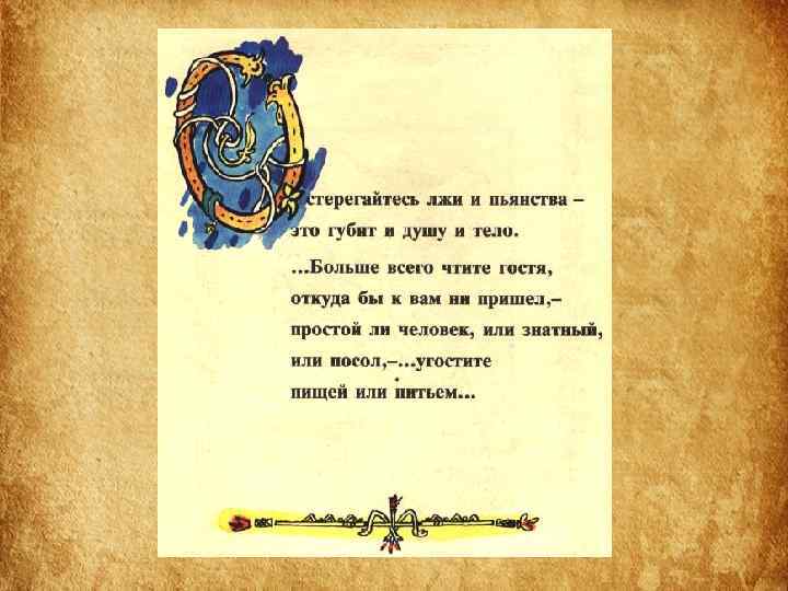 Структура Поучения • 1 часть «Поучения» – наставление, как следует управлять государством и самим собой. • 2 часть – «Летопись жизни» – служит наглядным примером неутомимой деятельности, жизни, полной невзгод, лишений и опасностей. • Наконец, последняя часть – « Письмо Олегу Святославовичу» – пример того, как следует подавлять своё личное горе, гнев, боль общим интересам.