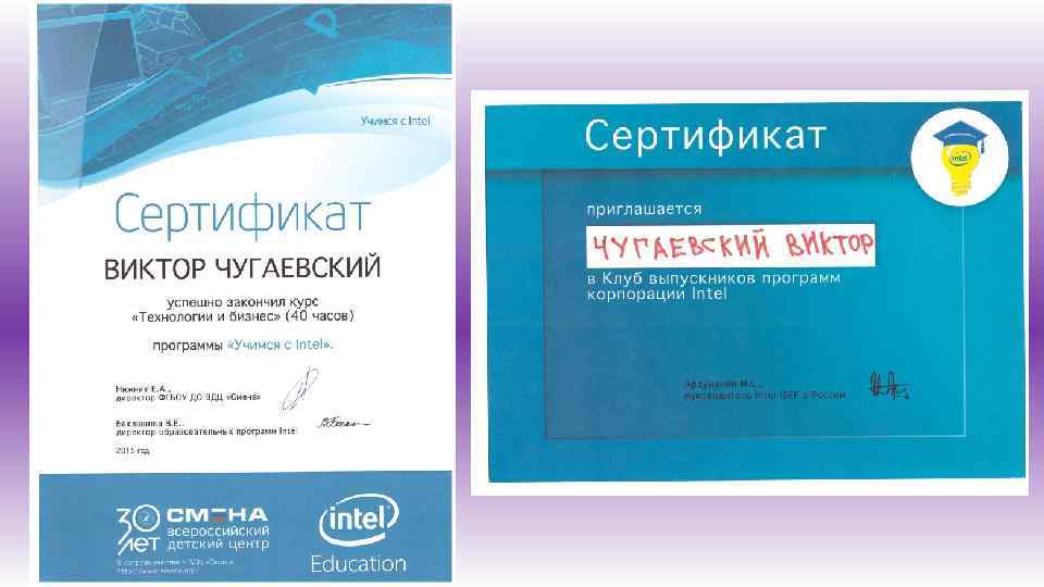 Мне также представился шанс обучатся по курсу "Технологии и бизнес" от компании Intel. Этот курс собрал талантливых ребят во Всероссийском детском центре «Смена» с задатками предпринимателей, которые хотят самореализоваться в направлении предпринимательства. Это единственная образовательная программа, для участия в котором нужно было пройти специальный отбор, придумав бизнес-идею в рамках "Смены". В течение курса я работал в различных программах, создавая таблицы, диаграммы, придумывая эмблемы, бизнесстратегии и многое другое. Разработка собственного проекта, создание и его реализация, защита— всё это огромный опыт для меня и участников, который станет крепким фундаментом для дальнейшего развития в этой области.