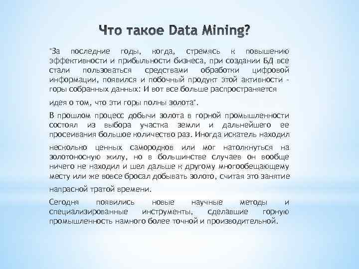 "За последние годы, когда, стремясь к повышению эффективности и прибыльности бизнеса, при создании БД все стали пользоваться средствами обработки цифровой информации, появился и побочный продукт этой активности горы собранных данных: И вот все больше распространяется идея о том, что эти горы полны золота". В прошлом процесс добычи золота в горной промышленности состоял из выбора участка земли и дальнейшего ее просеивания большое количество раз. Иногда искатель находил несколько ценных самородков или мог натолкнуться на золотоносную жилу, но в большинстве случаев он вообще ничего не находил и шел дальше к другому многообещающему месту или же вовсе бросал добывать золото, считая это занятие напрасной тратой времени. Сегодня появились новые научные методы и специализированные инструменты, сделавшие горную промышленность намного более точной и производительной.