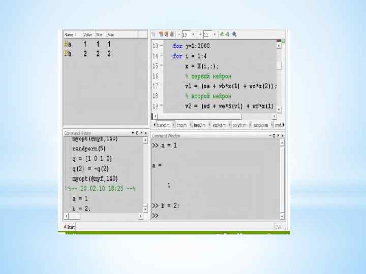 При запуске системы появляются следующие окна: 1. Command Window (правое нижнее на рис. ). В этом окне вводятся команды (после значка-приглашения >> ). В нём же отображаются результаты выполнения. Mat. Lab – это интерпретатор! Команды можно также записать в М-файл (текстовый файл *. m) в виде скрипта (последовательность команд) или функции (получает аргументы и выдаёт значения), тогда они будут запускаться при наборе в командном окне имени этого файла. Для создания такого файла вызовите редактор командой edit – появится окно редактора Editor (правое верхнее окно на рис. Если нажать клавишу «стрелка вверх» после значкаприглашения >> , то отобразится предыдущая набранная команда. 2. Command History (левое нижнее на рис. В этом окне отображаются все команды, которые запускали на исполнение вводом в командном окне.