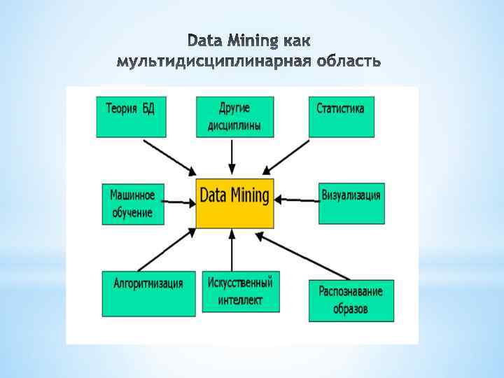 Data Mining - мультидисциплинарная область, возникшая и развивающаяся на базе таких наук как прикладная статистика, распознавание образов, искусственный интеллект, теория баз данных и др. , см. рис.