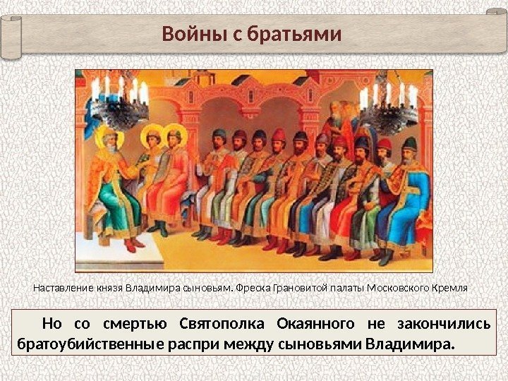 Войны с братьями Но со смертью Святополка Окаянного не закончились братоубийственные распри между сыновьями Владимира. Наставление князя Владимира сыновьям. Фреска Грановитой палаты Московского Кремля