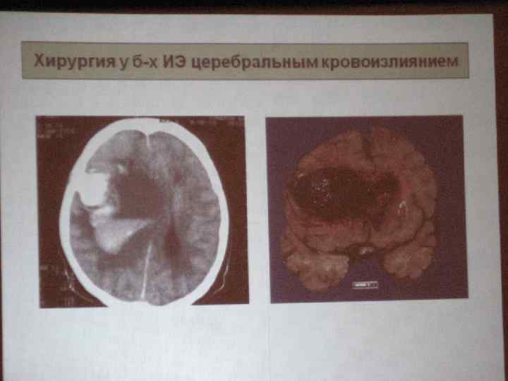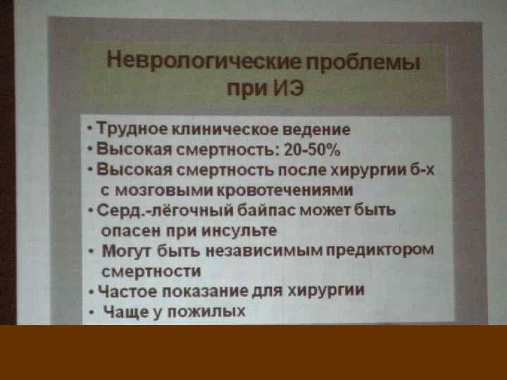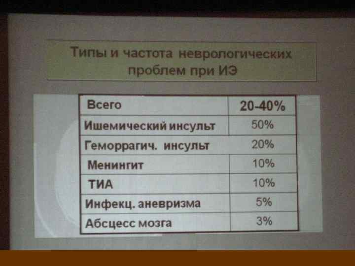 Объективные данные поражение ЦНС или периферической нервной системы встречается у 20 -40% больных ИЭ (15% случаев - ишемический инсульт; у 2 -10% больных наблюдается геморрагический инсульт, гнойный менингит или эмболические абсцессы мозга);