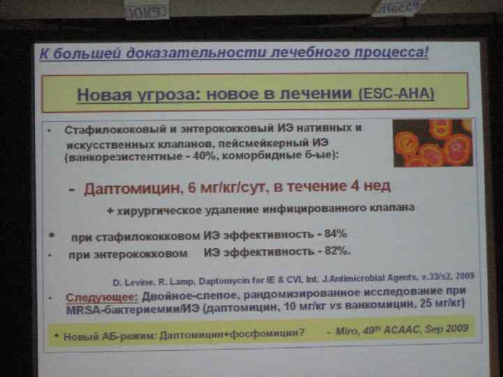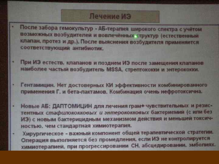 Режим антибиотикотерпии ИЭ, вызванного Stafilococcus 1. оксациллин – 2 г каждые 4 ч. в/в (4 -6 нед)+ амикацин – 7, 5 мг/кг каждые 12 ч. в/в (2 нед) 2. Цефазолин 2, 0 г каждые 8 ч. в/в (4 нед)+ амикацин – 7, 5 мг/кг каждые 12 ч. в/в (2 нед) 3. Ванкомицин 15 мг/кг каждые 12 ч. в/в (4 -6 нед) 4. Или тейкопланин – 12 мг/кг каждые 24 ч. в/в (4 -6 нед)