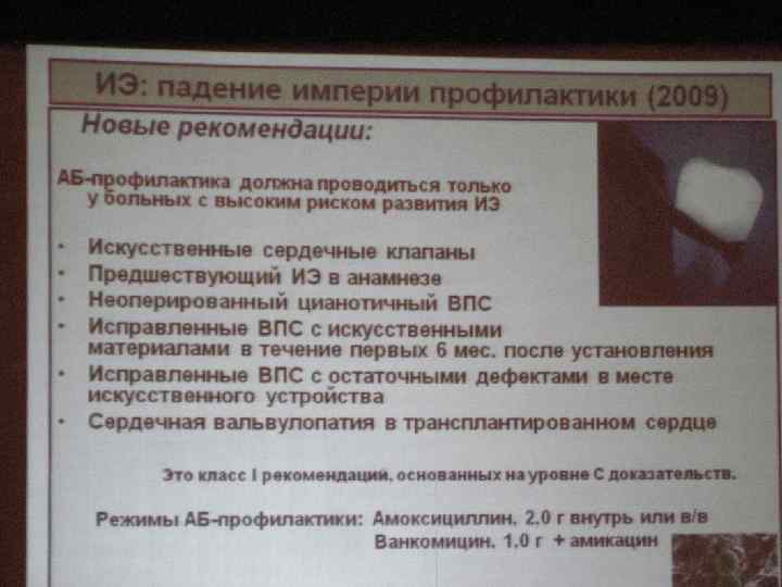 Новое в ИЭ: обучение пациентов Все больные с болезнями сердечных клапанов должны знать: • Симптомы и признаки ИЭ • Необходимость зубной и кожной гигиены • Риск персинга и татуировок • Важность антибактериальной профилактики должна подчеркиваться в группах высокого риска (больной - семейный врач – зубной врач)
