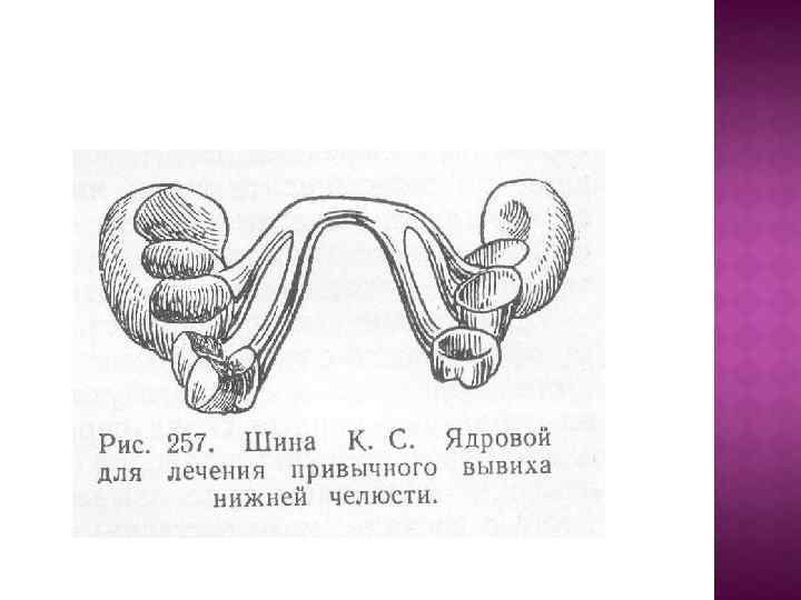 В случае чрезмерного открывания рта, сопровождающегося привычным вывихом в суставе, следует использовать шины или ортодонтические аппараты, ограничивающие открывание рта до 2– 2, 5 см (шина Ядровой, аппарат Петросова и др. ).
